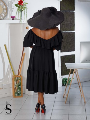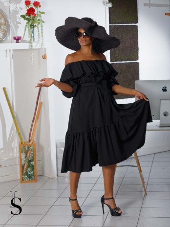Robe Bardot avec ses manches évasées, mi longue et sa ceinture...